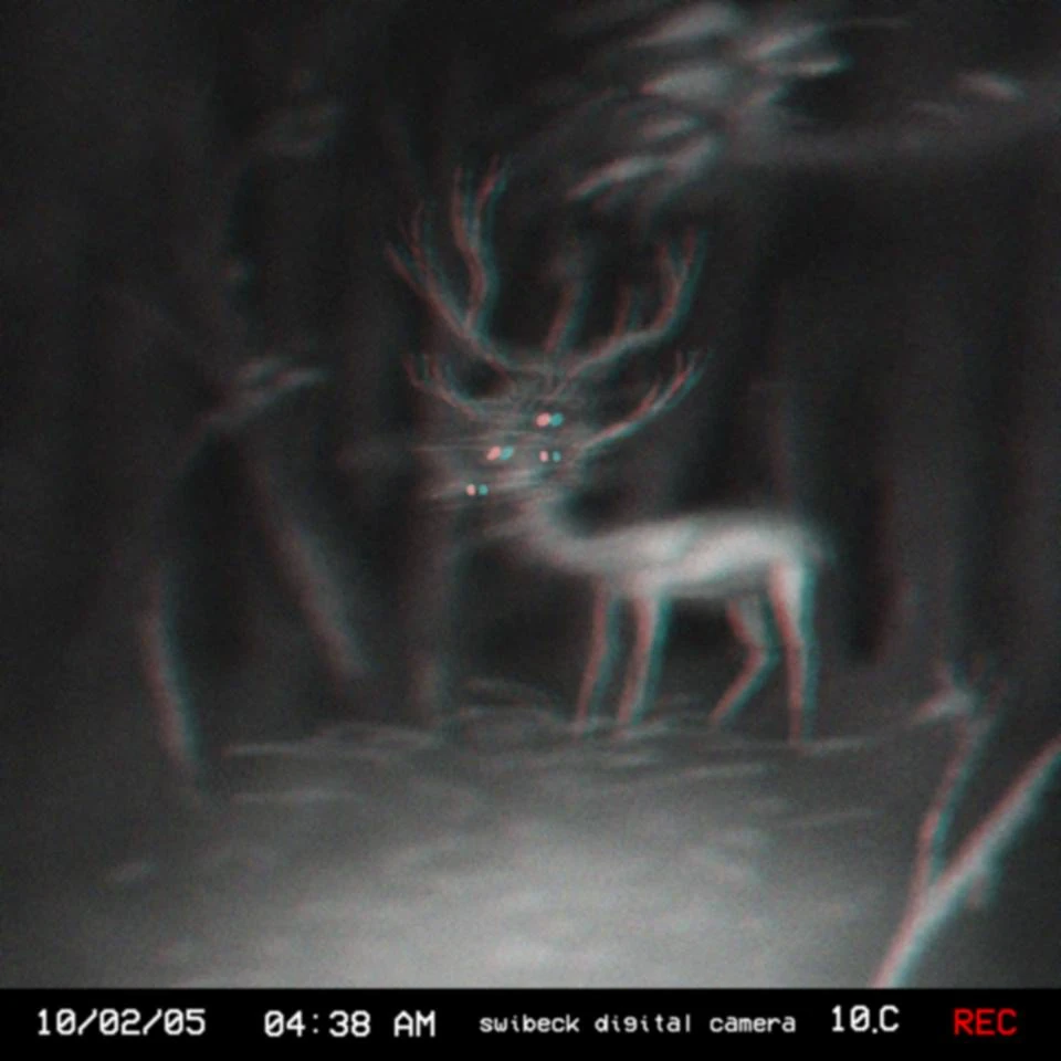 The Deer Impostor depicts a strange creature caught in a glitched trail camera, which resembles an average deer, however it possesses a severely deformed and grotesque head, to the point of being unrecognizable as a deer head.